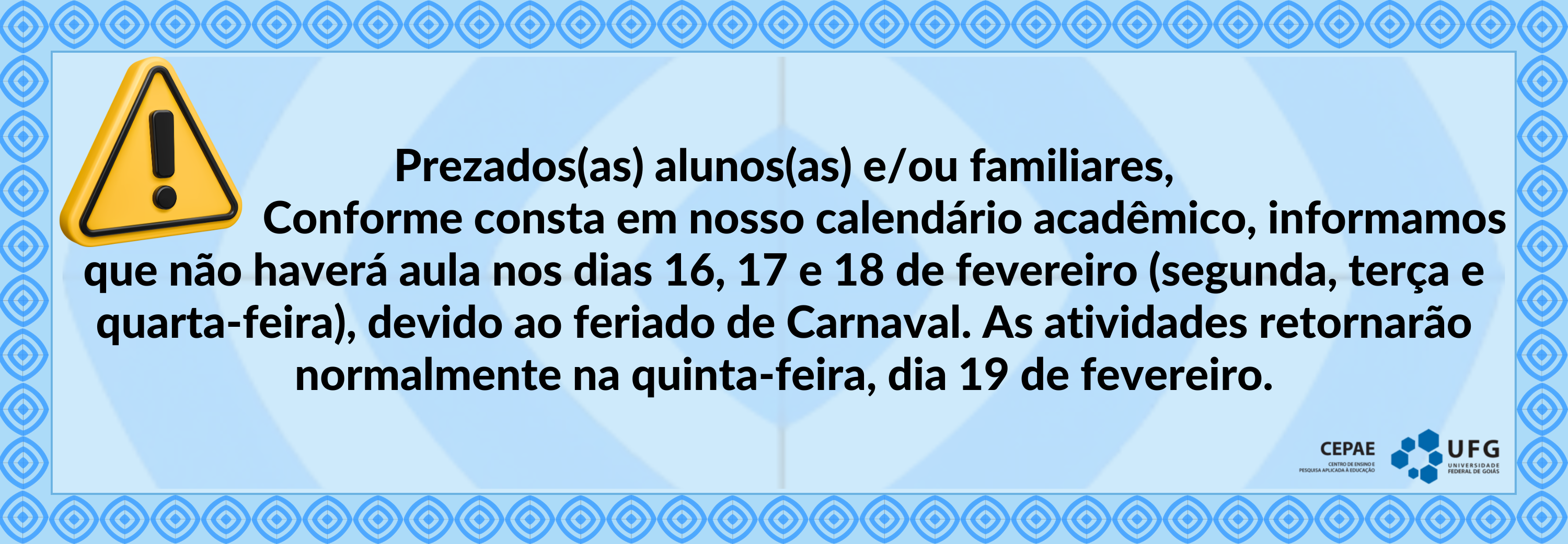 A Coordenação do Programa de Residência Profissional em Educação Especial Inclusiva em parceria com a Pró-reitoria de Graduação (PROGRAD/UFG) e com o Centro de Ensino e Pesquisa Aplicada à Educação (CEPAE/UFG) tem a honra de convidá-lo para a Aula Inaugural da primeira turma do Programa de Residência Profissional em Educação Especial Inclusiva (Lato sensu). Trata-se de um projeto pioneiro em âmbito nacional no que se refere à inclusão, acessibilidade e formação de professores. A iniciativa proposta pela UFG busca alinhar teoria, pesquisa e prática em contextos reais da Educação Básica, com ênfase na atuação junto ao público da Educação Especial. O evento marcará o início das atividades acadêmicas e será realizado no auditório da Biblioteca Central da UFG (Campus II) no dia 20 de fevereiro de 2026 às 8h.